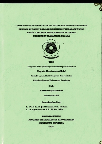 PUJIWINARNO, AHMAD and Emirzon, Joni and Trisaka, Agus (2025) LEGALITAS SURAT PERNYATAAN PELEPASAN HAK PENGUASAAN TANAH DI HADAPAN CAMAT DALAM PELAKSANAAN PENGADAAN TANAH UNTUK KEGIATAN PERTAMBANGAN BATUBARA OLEH BADAN USAHA MILIK NEGARA. Masters thesis, Universitas Sriwijaya.
