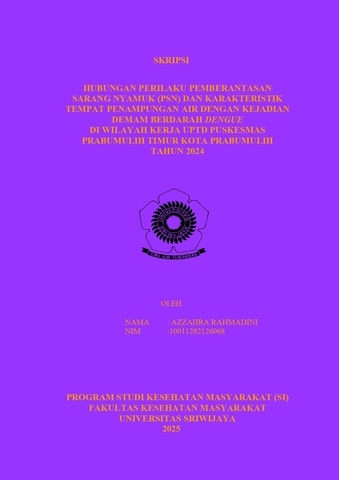 RAHMADINI, AZZAHRA and Lionita, Widya (2025) HUBUNGAN PERILAKU PEMBERANTASAN SARANG NYAMUK (PSN) DAN KARAKTERISTIK TEMPAT PENAMPUNGAN AIR DENGAN KEJADIAN DEMAM BERDARAH DENGUE DI WILAYAH KERJA UPTD PUSKESMAS PRABUMULIH TIMUR KOTA PRABUMULIH TAHUN 2024. Undergraduate thesis, Sriwijaya University.
