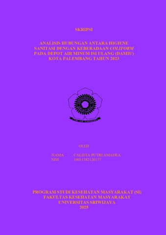 AMADEA, CALISTA PUTRI and Budiastuti, Anggun (2025) ANALISIS HUBUNGAN ANTARA HIGIENE SANITASI DENGAN KEBERADAAN COLIFORM PADA DEPOT AIR MINUM ISI ULANG (DAMIU) KOTA PALEMBANG TAHUN 2023. Undergraduate thesis, Sriwijaya University.