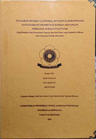 FITRIANI, RENI and Kartasari, Shelly Febriana (2025) PENGARUH DIVERSITAS GENDER, DIVERSITAS KEBANGSAAN, SUSTAINABILITY REPORT DAN KINERJA KEUANGAN TERHADAP AGRESIVITAS PAJAK (Studi Empiris Pada Perusahaan Property dan Real Estate yang Terdaftar di Bursa Efek Indonesia Periode 2018-2021). Undergraduate thesis, Sriwijaya University.