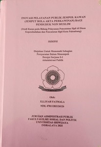 FATMALA, ELLIYAH and Imania, Katriza (2025) INOVASI PELAYANAN PUBLIK JEMPOL KAWAN (JEMPUT BOLA AKTA PERKAWINAN) BAGI PENDUDUK NON MUSLIM (STUDI KASUS PADA BIDANG PELAYANAN PENCATATAN SIPIL DI DINAS KEPENDUDUKAN DAN PENCATATAN SIPIL KOTA PALEMBANG). Undergraduate thesis, Sriwijaya University.