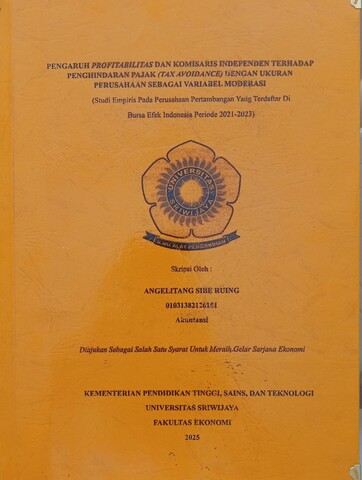 RUING, ANGELITANG SIBE and Patmawati, Patmawati (2025) PENGARUH PROFITABILITAS DAN KOMISARIS INDEPENDEN TERHADAP PENGHINDARAN PAJAK (TAX AVOIDANCE) DENGAN UKURAN PERUSAHAAN SEBAGAI VARIABEL MODERASI (STUDI EMPIRIS PADA PERUSAHAAN PERTAMBANGAN YANG TERDAFTAR DI BURSA EFEK INDONESIA PERIODE 2021-2023). Undergraduate thesis, Sriwijaya University.