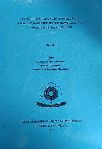 NURRAHMAN, MUHAMMAD FARIZ and Nurrizalia, Mega (2025) PENGARUH PEMBELAJARAN PRAMUKA WAJIB TERHADAP KARAKTER DISIPLIN SISWA KELAS VIII SMP NEGERI 4 KOTA PALEMBANG. Undergraduate thesis, Sriwijaya University.