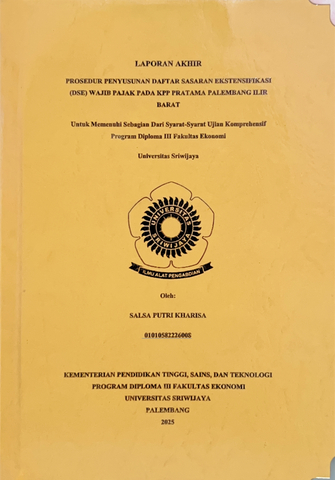 KHARISA, SALSA PUTRI and Maryati, Sri (2025) PROSEDUR PENYUSUNAN DAFTAR SASARAN EKSTENSIFIKASI (DSE) WAJIB PAJAK PADA KPP PRATAMA PALEMBANG ILIR BARAT. Diploma thesis, Sriwijaya University.