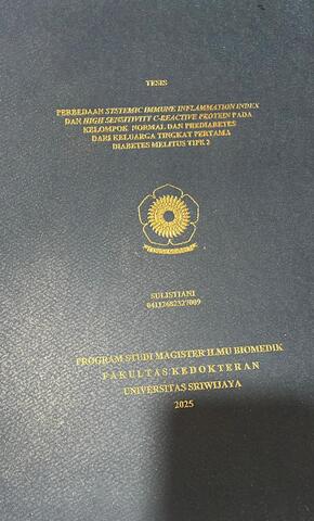 SULISTIANI, SULISTIANI and Liana, Phey and Oktariana, Desi (2025) PERBEDAAN SYSTEMIC IMMUNE INFLAMMATION INDEX DAN HIGH SENSITIVITY C-REACTIVE PROTEIN PADA KELOMPOK NORMAL DAN PREDIABETES DARI KELUARGA TINGKAT PERTAMA DIABETES MELITUS TIPE 2. Masters thesis, Sriwijaya University.