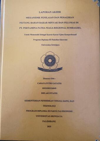 GAYATRI, CAHAYA PUTRI and Farhan, Muhammad (2025) MEKANISME PENILAIAN DAN PENAGIHAN PIUTANG BAHAN BAKAR MINYAK DAN PELUMAS DI PT PERTAMINA PATRA NIAGA REGIONAL SUMBAGSEL. Diploma thesis, Sriwijaya University.