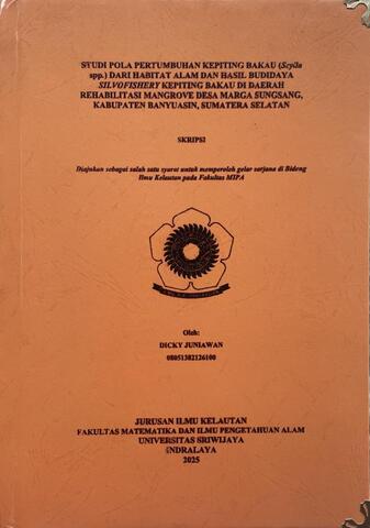 JUNIAWAN, DICKY and Ulqodry, Tengku Zia and Aryawati, Riris (2025) STUDI POLA PERTUMBUHAN KEPITING BAKAU (SCYLLA SPP.) DARI HABITAT ALAM DAN HASIL BUDIDAYA SILVOFISHERY KEPITING BAKAU DI DAERAH REHABILITASI MANGROVE DESA MARGA SUNGSANG, KABUPATEN BANYUASIN, SUMATERA SELATAN. Undergraduate thesis, Sriwijaya University.
