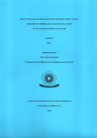 HASANAH, MIFTAHUL and Sumarni, Sri (2025) PERAN GURU DALAM MENGGUNAKAN METODE CERITA UNTUK KEMAMPUAN BERBICARA ANAK USIA 5-6 TAHUN DI TK NEGERI PEMBINA OGAN ILIR. Undergraduate thesis, Sriwijaya University.