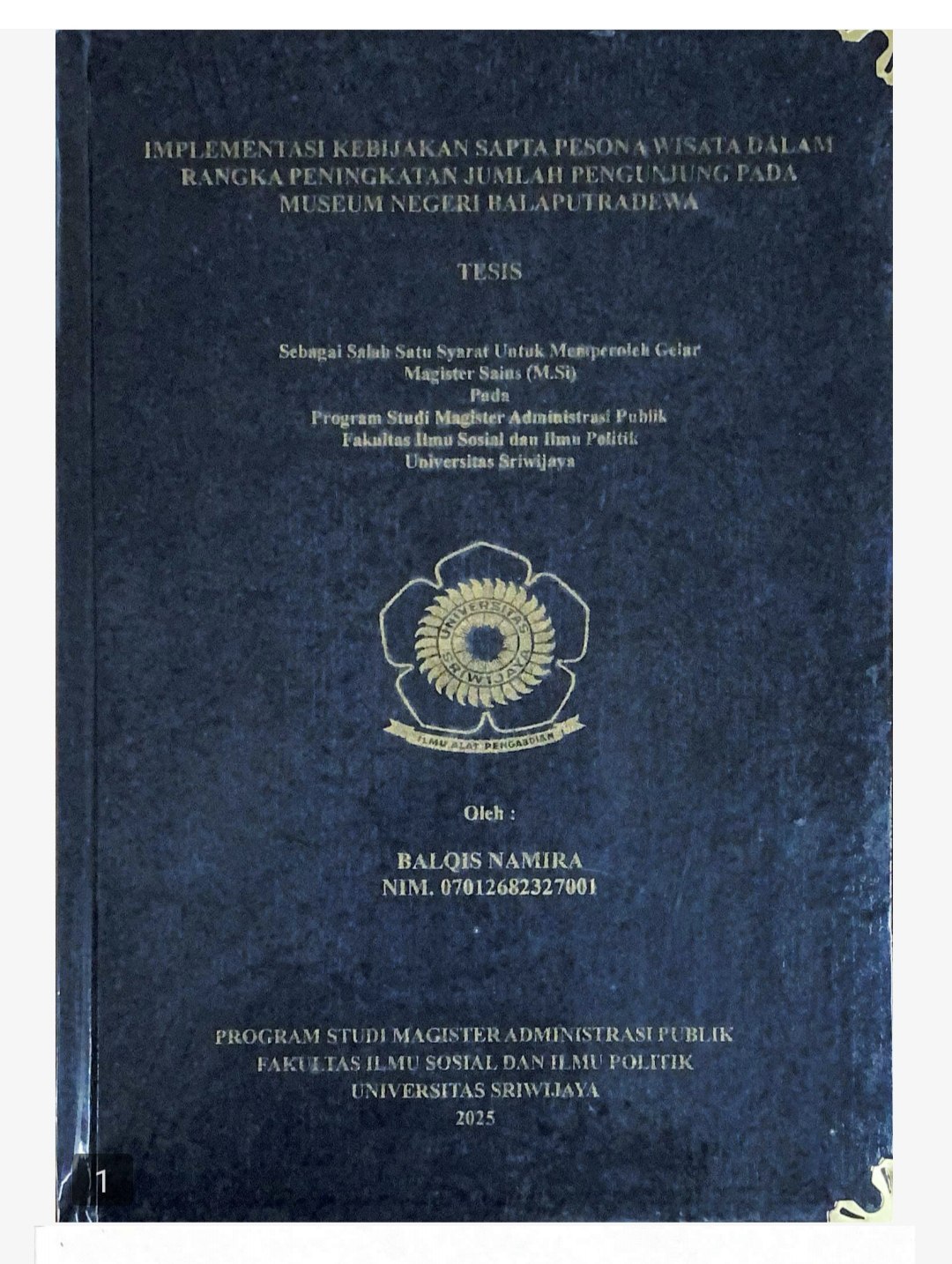 NAMIRA, BALQIS and Azhar, Azhar (2025) IMPLEMENTASI KEBIJAKAN SAPTA PESONA WISATA DALAM RANGKA PENINGKATAN JUMLAH PENGUNJUNG PADA MUSEUM NEGERI BALAPUTRADEWA. Masters thesis, Sriwijaya University.