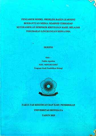 AGUSTINA, NABILA and Madang, Kodri (2025) PENGARUH MODEL PROBLEM BASED LEARNING BERBANTUAN MEDIA NEARPOD TERHADAP KETERAMPILAN BERPIKIR KRITIS DAN HASIL BELAJAR PERUBAHAN LINGKUNGAN SISWA SMA. Undergraduate thesis, Sriwijaya University.