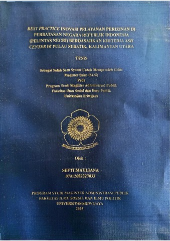 MAULIANA, SEFTI and Sriati, Sriati and Prabujaya, Sena Putra (2025) BEST PRACTICE INOVASI PELAYANAN PERIZINAN DI PERBATASAN NEGARA REPUBLIK INDONESIA (PELINTAS NEGRI) BERDASARKAN KRITERIA ASH CENTER DI PULAU SEBATIK, KALIMANTAN UTARA. Masters thesis, Sriwijaya University.