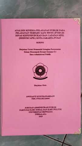 KUSUMAWARDANI, DWIYANTI and Aryansah, Januar Eko (2025) ANALISIS KINERJA PELAYANAN PUBLIK PADA PELAYANAN TERPADU SATU PINTU (PTSP) DI DINAS KEPENDUDUKAN DAN CATATAN SIPIL (DISDUKCAPIL) KOTA JAKARTA PUSAT. Undergraduate thesis, Sriwijaya University.