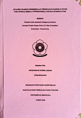 AKBAR, MUHAMMAD FADHIL and Lionardo, Andries and Jaya, Eko Pebryan (2025) ANALISIS FRAMING PEMBERITAAN PERINGATAN DARURAT (STUDI PADA PORTAL BERITA CNNINDONESIA.COM DAN KOMPAS.COM). Undergraduate thesis, Sriwijaya University.