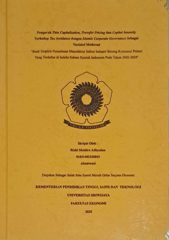 ADHYAKSA, RIZKI MEIDIRA and Soediro, Achmad (2025) PENGARUH THIN CAPITALIZATION, TRANSFER PRICING DAN CAPITAL INTENSITY TERHADAP TAX AVOIDANCE DENGAN ISLAMIC CORPORATE GOVERNANCE SEBAGAI VARIABEL MODERASI “STUDI EMPIRIS PERUSAHAAN MANUFAKTUR SEKTOR INDUSTRI BARANG KONSUMSI PRIMER YANG TERDAFTAR DI INDEKS SAHAM SYARIAH INDONESIA PADA TAHUN 2020-2024”. Undergraduate thesis, Sriwijaya University.
