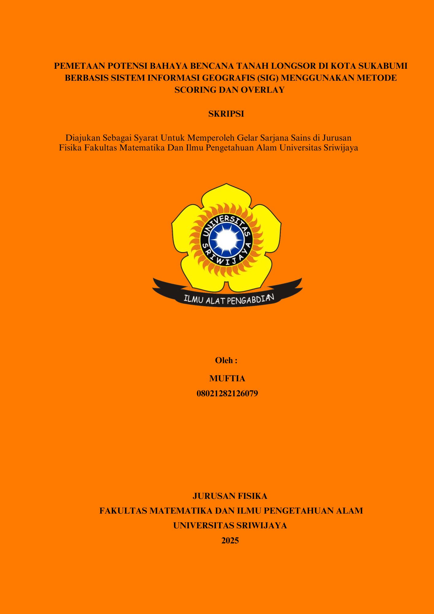 MUFTIA, MUFTIA and Mardiansyah, Wijaya and Setiabudidaya, Dedi (2025) PEMETAAN POTENSI BAHAYA BENCANA TANAH LONGSOR DI KOTA SUKABUMI BERBASIS SISTEM INFORMASI GEOGRAFIS (SIG) MENGGUNAKAN METODE SCORING DAN OVERLAY. Undergraduate thesis, Sriwijaya University.