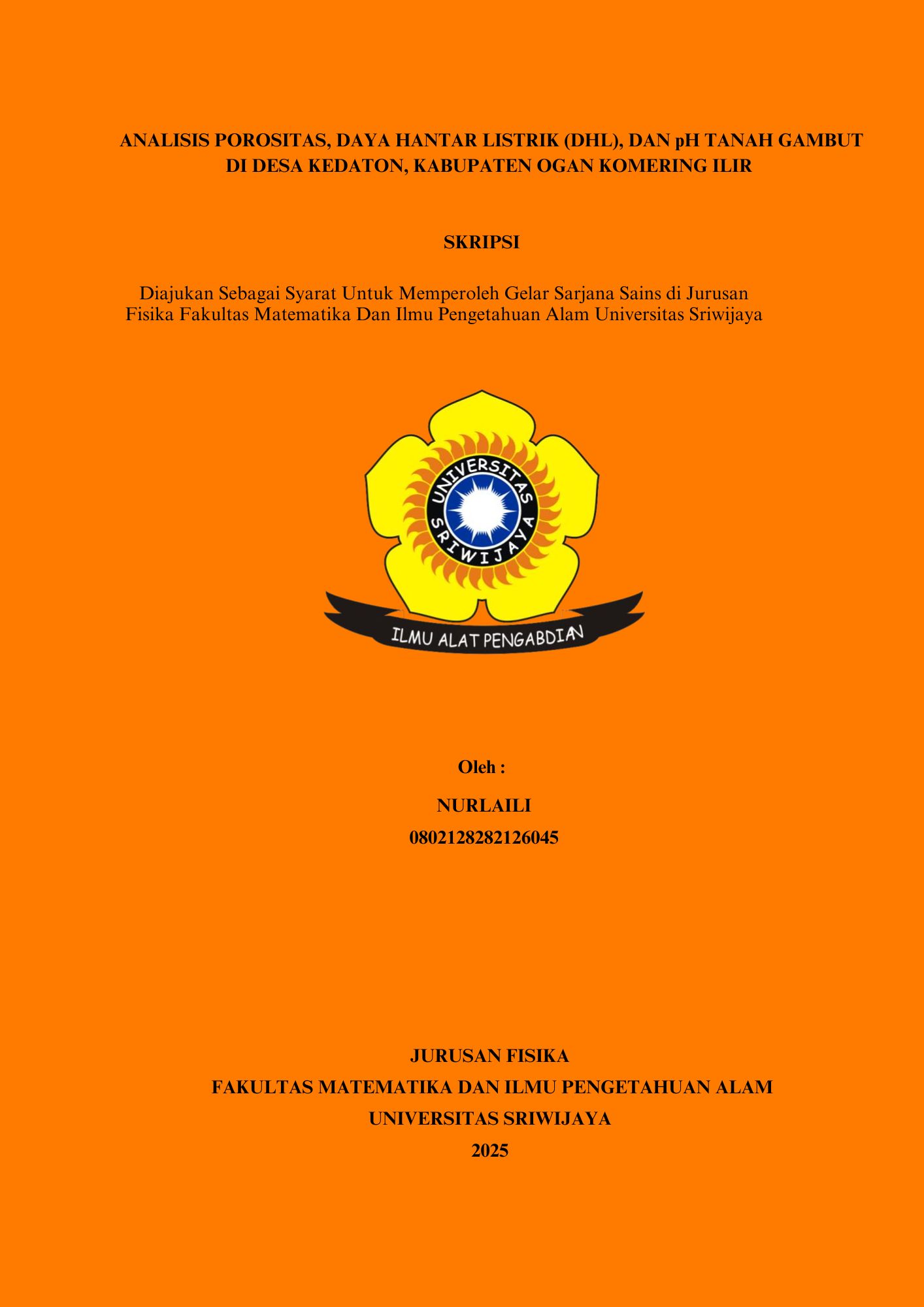 NURLAILI, NURLAILI and Virgo, Frinsyah and Sutopo, Sutopo (2025) ANALISIS POROSITAS, DAYA HANTAR LISTRIK (DHL), DAN pH TANAH GAMBUT DI DESA KEDATON, KABUPATEN OGAN KOMERING ILIR. Undergraduate thesis, Sriwijaya University.