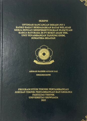 SAZ, AHMAD NAZHIR ASYAM and Puspita, Mega and Oktarinasari, Eva (2025) OPTIMASI RANCANGAN DESAIN PIT 2 BANKO BARAT BERDASARKAN BATAS WILAYAH KERJA DENGAN MEMPERHITUNGKAN FLUKTUASI HARGA BATUBARA DI PT BUKIT ASAM TBK. UNIT PENAMBANGAN TANJUNG ENIM, SUMATERA SELATAN. Undergraduate thesis, Sriwijaya University.