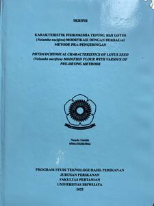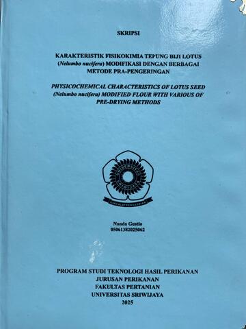 GUSTIO, NANDA and Ridhowati, Sherly (2025) KARAKTERISTIK FISIKOKIMIA TEPUNG BIJI LOTUS (Nelumbo nucifera) MODIFIKASI DENGAN BERBAGAI METODE PRA-PENGERINGAN. Undergraduate thesis, Sriwijaya University.