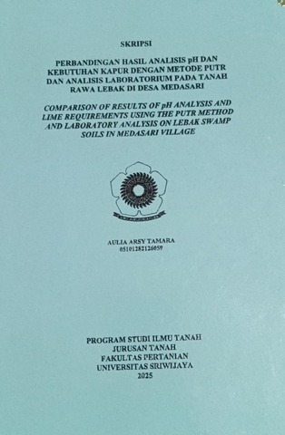 TAMARA, AULIA ARSY and Bakri, Bakri (2025) PERBANDINGAN HASIL ANALISIS PH DAN KEBUTUHAN KAPUR DENGAN METODE PUTR DAN ANALISIS LABORATORIUM PADA TANAH RAWA LEBAK DI DESA MEDASARI. Undergraduate thesis, Sriwijaya University.
