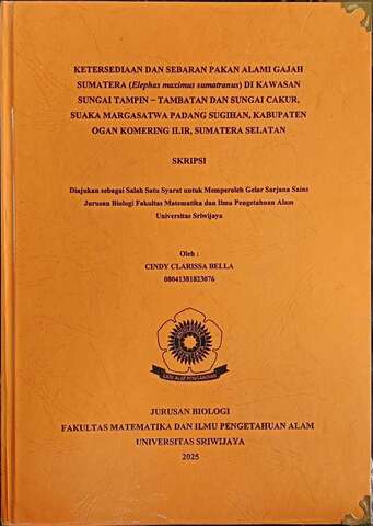 BELLA, CINDY CLARISSA and Setiawan, Arum and Yustian, Indra (2025) KETERSEDIAAN DAN SEBARAN PAKAN ALAMI GAJAH SUMATERA (Elephas maximus sumatranus) DI KAWASAN SUNGAI TAMPIN − TAMBATAN DAN SUNGAI CAKUR, SUAKA MARGASATWA PADANG SUGIHAN, KABUPATEN OGAN KOMERING ILIR, SUMATERA SELATAN. Undergraduate thesis, Sriwijaya University.