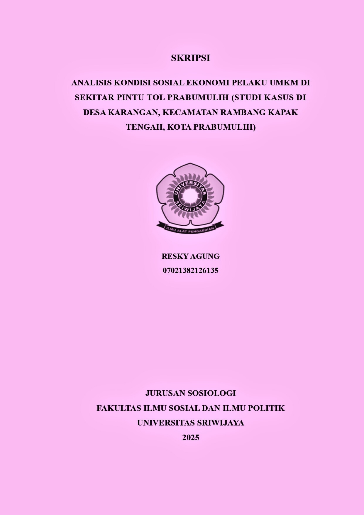 AGUNG, RESKY and Kurniawan, Rudy (2025) ANALISIS KONDISI SOSIAL EKONOMI PELAKU UMKM DI SEKITAR PINTU TOL PRABUMULIH (STUDI KASUS DI DESA KARANGAN, KECAMATAN RAMBANG KAPAK TENGAH, KOTA PRABUMULIH). Undergraduate thesis, Sriwijaya University.