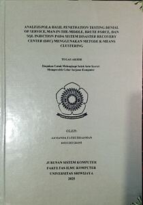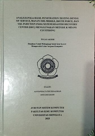 FATHURRAHMAN, ARMANDA and Heryanto, Ahmad and Hermansyah, Adi (2025) ANALISIS POLA HASIL PENETRATION TESTING DENIAL OF SERVICE, MAN-IN-THE-MIDDLE, BRUTE FORCE, DAN SQL INJECTION PADA SISTEM DISASTER RECOVERY CENTER (DRC) MENGGUNAKAN METODE K-MEANS CLUSTERING. Undergraduate thesis, Sriwijaya University.
