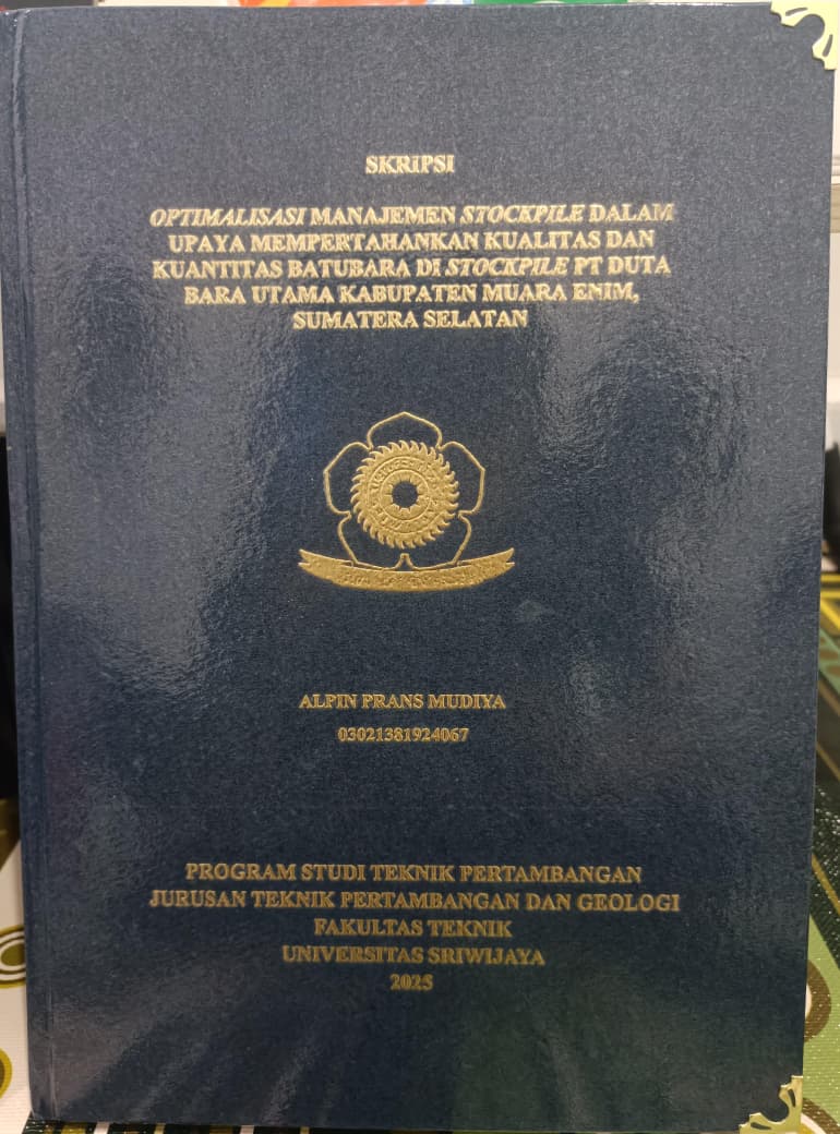 MUDIYA, ALPIN PRANS and Pebrianto, Rosihan and Oktarinasari, Eva (2025) OPTIMALISASI MANAJEMEN STOCKPILE DALAM UPAYA MEMPERTAHANKAN KUALITAS DAN KUANTITAS BATUBARA DI STOCKPILE PT DUTA BARA UTAMA KABUPATEN MUARA ENIM, SUMATERA SELATAN. Undergraduate thesis, Sriwijaya University.