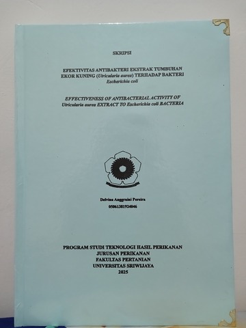 ANGGRAINI, DELVINA PEREIRA and Sudirman, Sabri (2025) EFEKTIVITAS ANTIBAKTERI EKSTRAK TUMBUHAN EKOR KUNING (UTRICULARIA AUREA) TERHADAP BAKTERI ESCHERICIA COLI. Undergraduate thesis, Sriwijaya University.