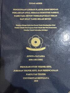 NATASHA, JUWITA and Rosidawani, Rosidawani (2025) PENGGUNAAN LIMBAH PLASTIK HDPE DENGAN PERLAKUAN AWAL SEBAGAI SUBTITUSI PARSIAL PASIR PADA BETON TERHADAP KUAT TEKAN DAN KUAT TARIK BELAH BETON. Undergraduate thesis, Sriwijaya University.