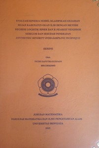 KUSNADI, NICHO SAPUTRA and Resti, Yulia and Kresnawati, Endang Sri (2025) EVALUASI KINERJA MODEL KLASIFIKASI KEJADIAN HUJAN KABUPATEN OGAN ILIR DENGAN METODE REGRESI LOGISTIK BINER DAN K-NEAREST NEIGHBOR SEBELUM DAN SESUDAH PENERAPAN SYNTHETHIC MINORITY OVER-SAMPLING TECHNIQUE. Undergraduate thesis, Sriwijaya University.