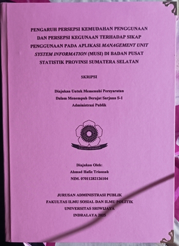 TRIANSAH, AHMAD HAFIZ and Alamsyah, Alamsyah (2025) PENGARUH PERSEPSI KEMUDAHAN PENGGUNAAN DAN PERSEPSI KEGUNAAN TERHADAP SIKAP PENGGUNAAN PADA APLIKASI MANAGEMENT UNIT SYSTEM INFORMATION (MUSI) DI BADAN PUSAT STATISTIK PROVINSI SUMATERA SELATAN. Undergraduate thesis, Sriwijaya University.