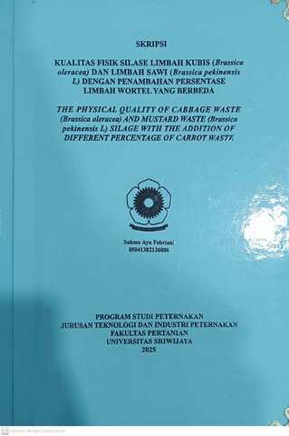 FEBRIANI, SUKMA AYU and Susanda Nurdin, Aptriansyah (2025) KUALITAS FISIK SILASE LIMBAH KUBIS (Brassica oleracea) DAN LIMBAH SAWI (Brassica pekinensis L) DENGAN PENAMBAHAN PERSENTASE LIMBAH WORTEL YANG BERBEDA. Undergraduate thesis, Sriwijaya University.