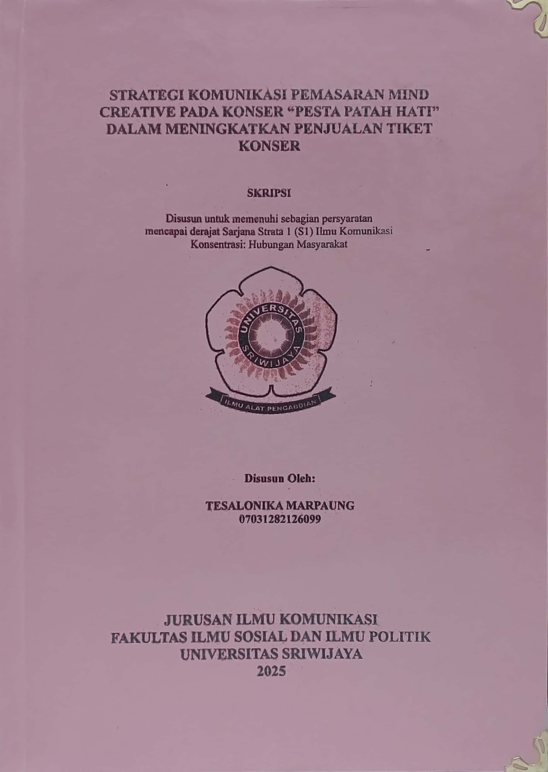 MARPAUNG, TESALONIKA and Mahriani, Retna and Karmila, Leti (2025) STRATEGI KOMUNIKASI PEMASARAN MIND CREATIVE PADA KONSER “PESTA PATAH HATI” DALAM MENINGKATKAN PENJUALAN TIKET KONSER. Undergraduate thesis, Sriwijaya University.