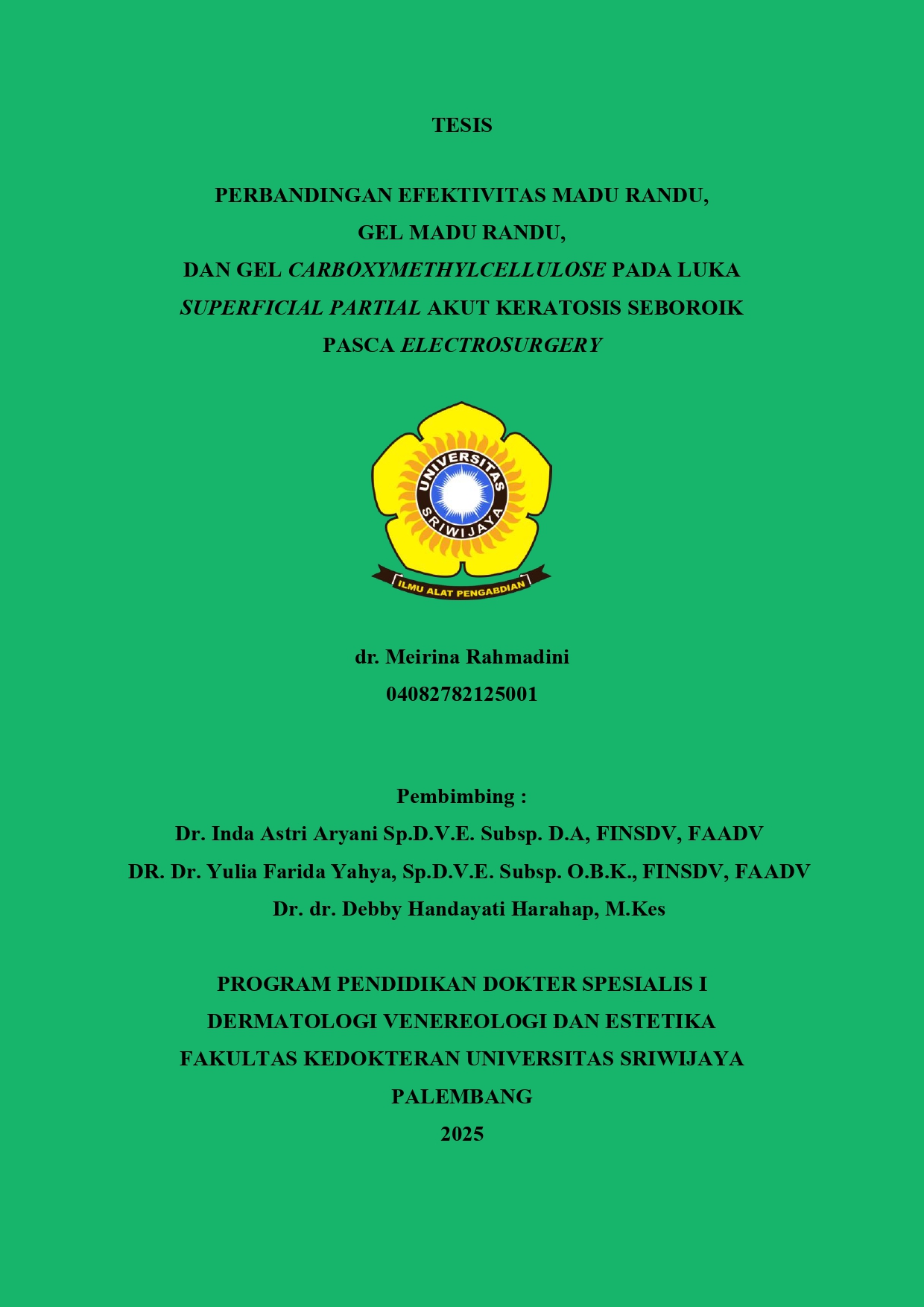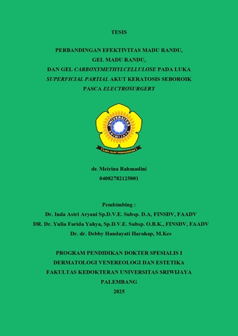 RAHMADINI, MEIRINA and Aryani, Inda Astri and Yahya, Yulia Farida and Harahap, Debby Handayati (2025) PERBANDINGAN EFEKTIVITAS MADU RANDU, GEL MADU RANDU, DAN GEL CARBOXYMETHYLCELLULOSE PADA LUKA SUPERFICIAL PARTIAL AKUT KERATOSIS SEBOROIK PASCA ELECTROSURGERY. Undergraduate thesis, Sriwijaya University.