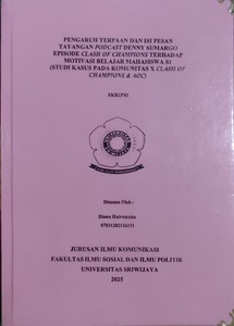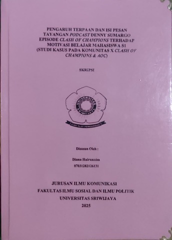 HAIRUNNISA, DIANA and Saraswati, Erlisa and Priambodo, Galih (2025) PENGARUH TERPAAN DAN ISI PESAN TAYANGAN PODCAST DENNY SUMARGO EPISODE CLASH OF CHAMPIONS TERHADAP MOTIVASI BELAJAR MAHASISWA S1 (STUDI KASUS PADA KOMUNITAS X CLASH OF CHAMPIONS & AOC). Undergraduate thesis, Sriwijaya University.
