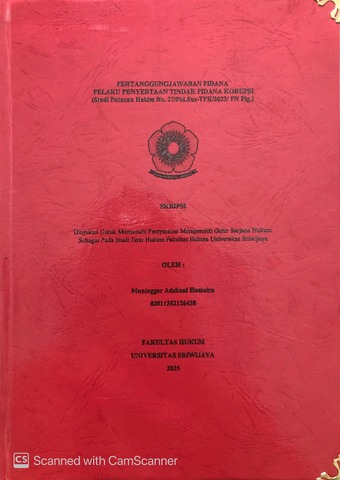 HUMAIRA, MUNINGGAR ADZHANI and Adisti, Neisa Angrum and Zulaikha, Almira Novia (2025) PERTANGGUNGJAWABAN PIDANA PELAKU PENYERTAAN TINDAK PIDANA KORUPSI (STUDI PUTUSAN HAKIM NO. 27/PID.SUS-TPK/2023/PN PLG). Undergraduate thesis, Sriwijaya University.