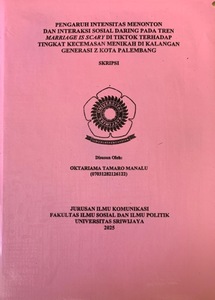 MANALU, OKTARIAMA TAMARO and Saraswati, Erlisa and Pratiwi, Feny Selly (2025) PENGARUH INTENSITAS MENONTON DAN INTERAKSI SOSIAL DARING PADA TREN MARRIAGE IS SCARY DI TIKTOK TERHADAP TINGKAT KECEMASAN MENIKAH DI KALANGAN GENERASI Z KOTA PALEMBANG. Undergraduate thesis, Sriwijaya University.