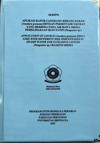 RICO, MUHAMAD and Jubaedah, Dade (2025) APLIKASI KAPUR CANGKANG KERANG DARAH (Anadara granosa) DENGAN PERSENTASE UKURAN YANG BERBEDA PADA AIR RAWA MEDIA PEMELIHARAAN IKAN PATIN (Pangasius sp.). Undergraduate thesis, Sriwijaya University.