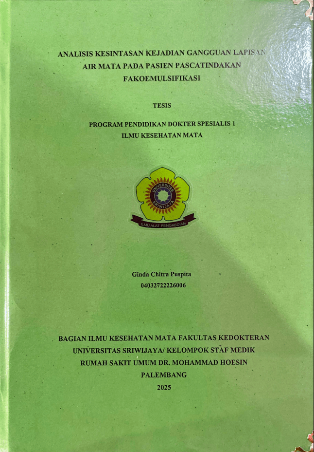 PUSPITA, GINDA CHITRA and Tribowo, Anang and Theodorus, Theodorus (2025) ANALISIS KESINTASAN KEJADIAN GANGGUAN LAPISAN AIR MATA PADA PASIEN PASCATINDAKAN FAKOEMULSIFIKASI. Masters thesis, Sriwijaya University.