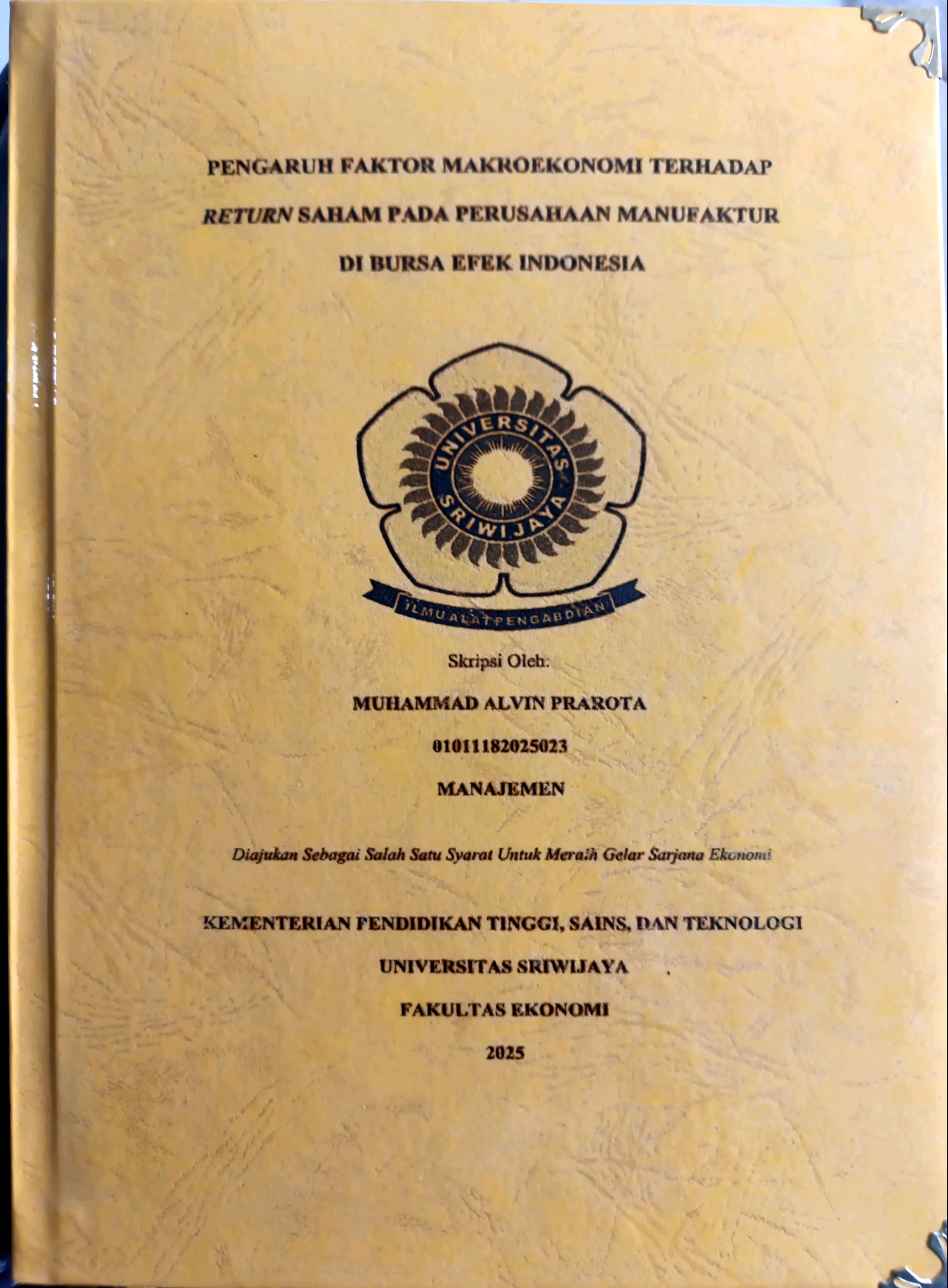 PRAROTA, MUHAMMAD ALVIN and Andriana, Isni (2025) PENGARUH FAKTOR MAKROEKONOMI TERHADAP RETURN SAHAM PADA PERUSAHAAN MANUFAKTUR DI BURSA EFEK INDONESIA. Undergraduate thesis, Sriwijaya University.