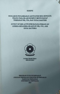 Termite bento grass (Leersia hexandra) is a species of freshwater grass that has a higher nutritional content and nutritional value than other marsh grasses, this grass is generally not available all the time, to ensure the availability of this grass requires silage processing technology, silage technology is animal feed made through the fermentation process of forage materials (such as grass, corn, or leguminous plants) under anaerobic conditions (without air). This process aims to preserve forage so that it can be used as feed during the dry season or when the availability of fresh feed is limited. This research aims to study the effect of Local Microorganism Activator (MOL) Banana Bark on Silage of Termite Bento Grass on the content of NH3, VFA and Total Bacteria. This research was conducted from October to December 2024 at the Experimental Cage of Animal Husbandry Study Program, Faculty of Agriculture, Sriwijaya University and continued at the Animal Nutrition and Diet Laboratory, Faculty of Agriculture, Sriwijaya University. The design used in this study was a complete randomized design (CRD) with 4 treatments and 4 replicates so that 16 experimental units were obtained. the treatments given consisted of P0 (100% Leersia hexandra), P1 (100% Leersia hexandra + 3% Banana Bark MOL), P2 (100% Leersia hexandra +6% Banana Bark MOL), P3 (100% Leersia hexandra + 9% Banana Bark MOL). The parameters observed in this study were Ammonia (NH3), Volatile Fatty Acids (VFA) and Total Bacteria. Analysis of research data used analysis of variance and if the treatment had a significant effect, Duncan's further test was conducted. The results showed that the treatment had a significant effect (P<0.05) on the value of NH3, VFA, and Total Bacteria. The results of further tests on NH3 obtained the highest value of P3 at 10.20 mM and the lowest P1 at 4.70 mM, the highest VFA value P3 at 83.71 mM and the lowest P1 at 63.67 mM, the highest Total Bacteria value P3 at 7.05 109 cfu/ml and the lowest P1 at 4.35 cfu 109 cfu/ml. The best addition of Banana Bark MOL in this study is P2 100% Leersia hexandra + 6% Banana Bark MOL, with an NH3 value of 8.09 mM, a VFA value of 77.15mM, and a Total Bacteria value of 6.67 109 cfu/ml.