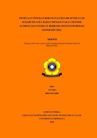 NUNIKA, NUNIKA and Khakim, Mokhamad Yusup Nur and Affandi, Azhar Kholiq (2025) PEMETAAN TINGKAT KERAWANAN BANJIR DI WILAYAH SUKABUMI JAWA BARAT MENGGUNAKAN METODE SCORING DAN OVERLAY BERBASIS SISTEM INFORMASI GEOGRAFIS (SIG). Undergraduate thesis, Sriwijaya University.